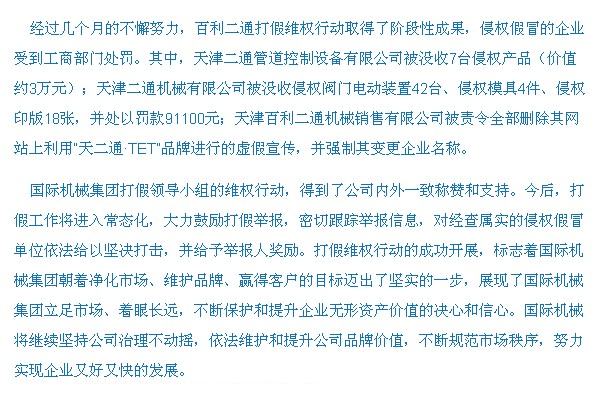 本公司是“TET”、“天二通”和“天二通TET”三個商標(biāo)的唯一商標(biāo)所有權(quán)人。本公司從未授權(quán)及許可任何單位、個人使用本公司的注冊商標(biāo),以及在公司以外的地點(diǎn)生產(chǎn)制造本公司的相關(guān)產(chǎn)品,也從未在天津地區(qū)設(shè)立銷售公司。凡冒充本公司名義或假冒本公司注冊商標(biāo)進(jìn)行生產(chǎn)或銷售的行為,均屬違法侵權(quán),本公司保留追究法律責(zé)任的權(quán)利。特此聲明!